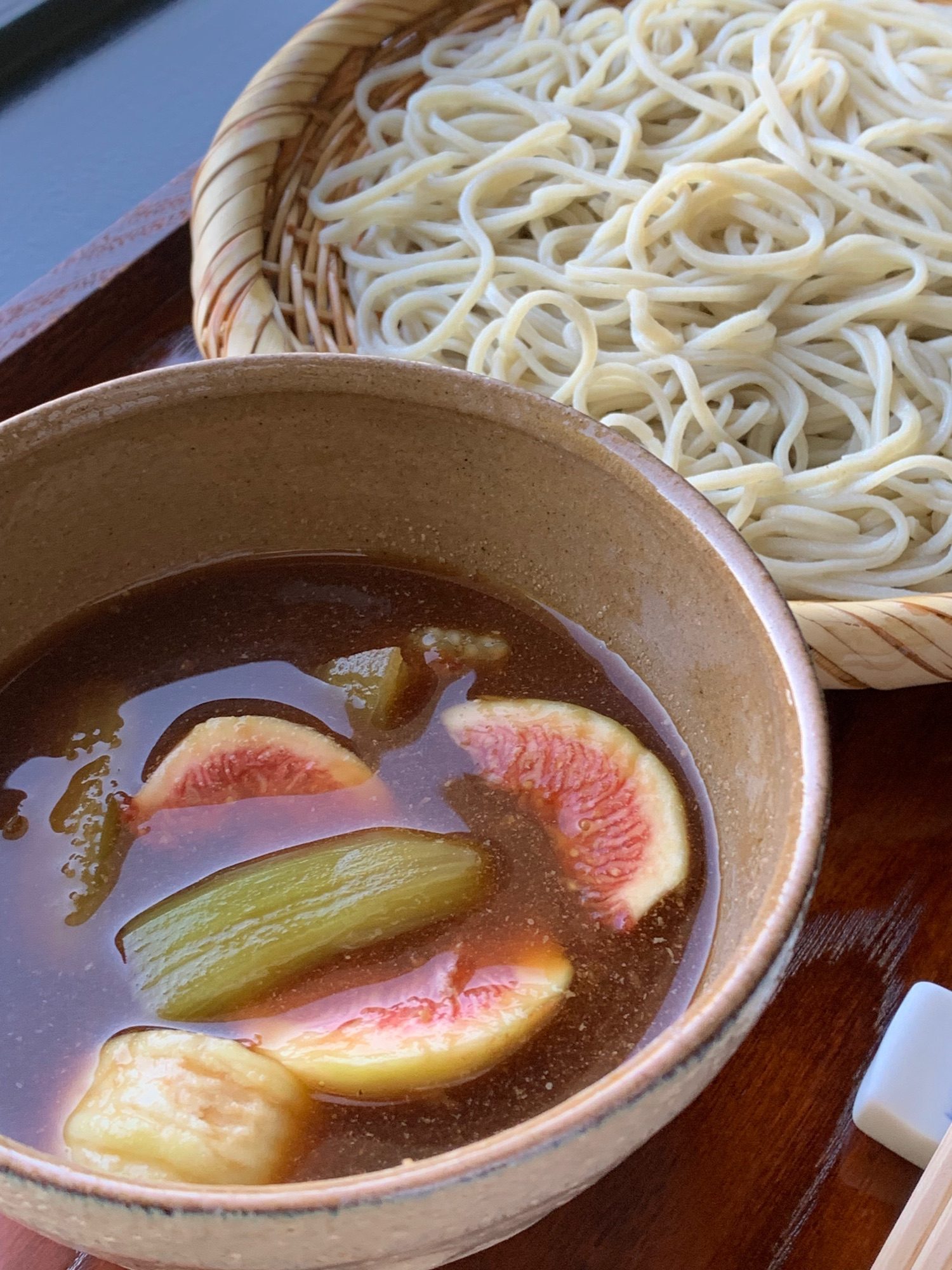 さまざまな風味を試す中で、最もそばと果実を引き立てたのが「ごま」と「酢橘」でした。ごまの香ばしさがいちじくの甘みを包み込み、酢橘の酸味が全体を引き締めてくれる。しかし、いちじくだけではどこか落ち着かない。そこで加えたのが、秋の定番・なす。秋なすをつゆに浮かべることで、深みが生まれました。こうして完成した「いちじくと秋なすのそば」は、甘み・香り・酸味・旨みが調和した、秋のそばです。